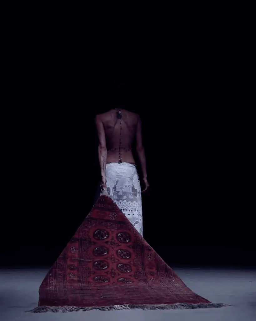 In a dark room, illuminated only by a single beam of light, a masked woman dances on an oriental Carpet. Her body, partly exposed and partly concealed, becomes a symbol of both vulnerability and strength. Every movement seems like an act of rebellion against invisibility. The oriental Carpet beneath her feet turns into a stage of inner transformation; a place where tradition, memory, and self-determination converge.