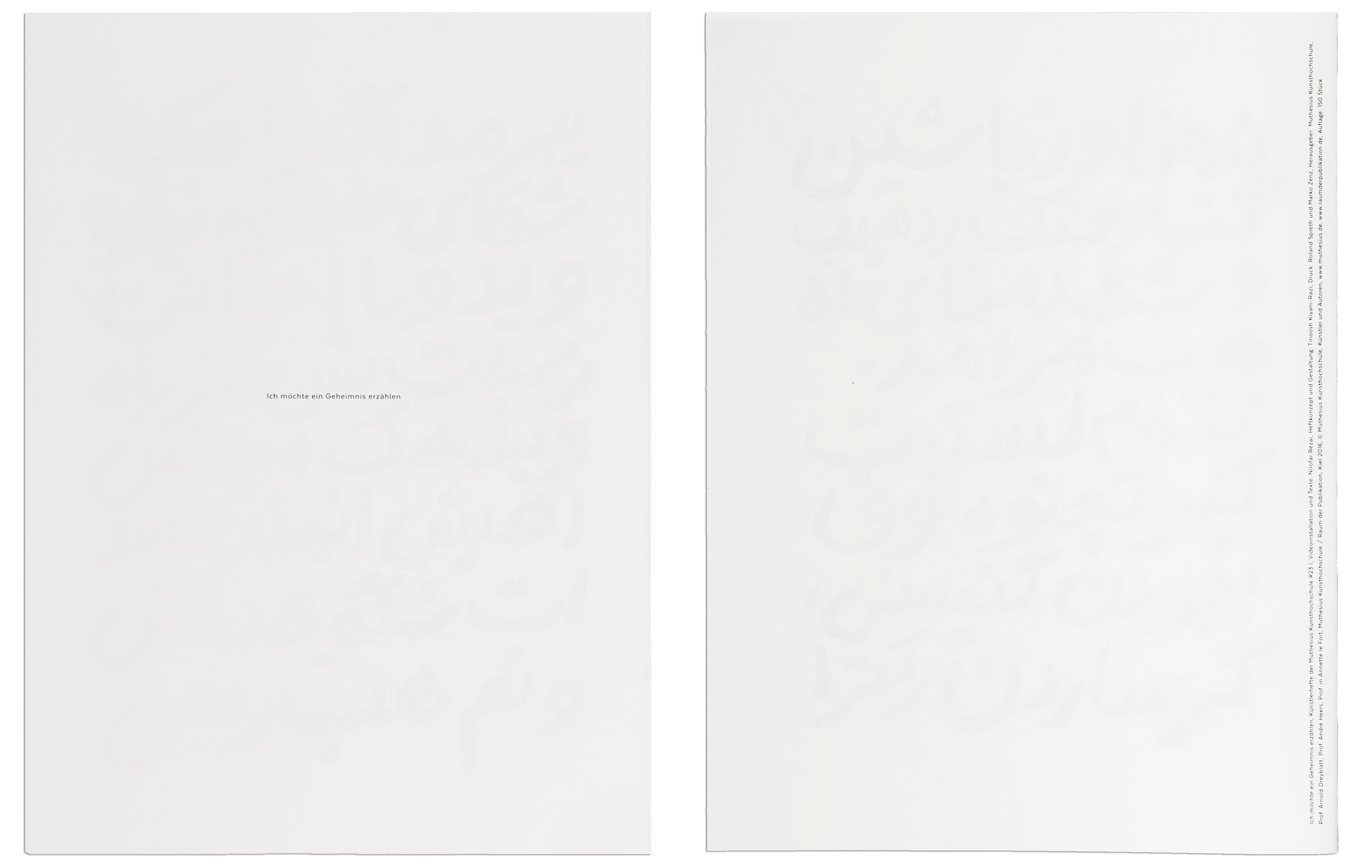 In ihrem Werk »Das Geheimnis« erzählt Nilofar Rezai in einer Videoperformance-Trilogie ein Geheimnis. Sie erzählt es, indem sie es nicht erzählt. Im ersten der drei Videos deutet sie anfänglich auf Deutsch an, ein Geheimnis offenbaren zu wollen. Im weiteren Verlauf hört man eine Aneinanderreihung zusammenhangsloser, persischer Wörter. Am Ende bedankt sie sich wieder auf Deutsch für das Zuhören. Dieses Video wurde in Heftform umgesetzt, indem die Reihenfolge der Buchstaben der jeweiligen Wörter des gesprochenen Textes geändert wurde. Diese Zeichen wurden handschriftlich mit schwarzer Tusche aufs Papier gebracht.